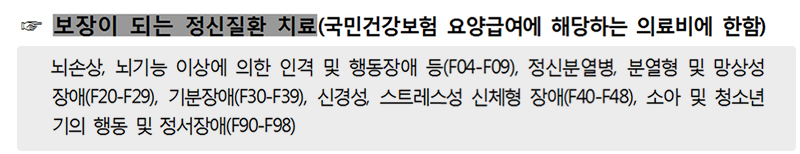 한편 증상이 비교적 명확해 치료 목적 확인이 가능한 일부 정신질환은 보장 대상에 포함됐다.