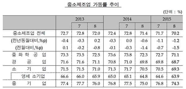 IBK경제연구소가 12일 발표한 '2015년 8월 중소제조업 동향' 에 따르면 중소제조업체 가동률은 70.2%로 지난해 같은 달보다 1.2%포인트 하락했다. 이번 조사는 종사자 5~299명 규모 제조업체를 대상으로 했다.