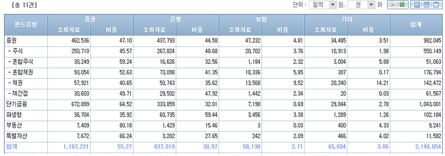 은행 비중은 38.97%(83조7019억원)였다. 보험사 펀드 판매는 5조8130억원(2.71%)에 그쳤다.
