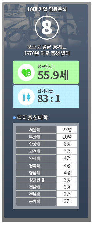 포스코 임원 84명의 평균 나이는 55.9세였다. 조사대상 10대 기업 중 가장 많다. 포스코를 제외하고 임원 나이가 가장 많은 기업인 현대모비스(54.9세)보다 평균 1살 많다. 조사 대상 기업 중 가장 적은 네이버(46.2세)보다는 무려 10살 가까이 많았다.