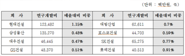 실제 현대건설은 기술력 강화를 위해 연구인원을 2013년 100명에서 현재 180명으로 늘리는 등 우수인력 확보에 주력하고 있다. 지난해 연구개발 부문에 투자한 금액만 1230억원에 달한다.