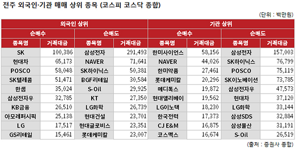 전주 외인·기관 순매수 상위…외인·기관, 삼성전자만 4484억원 순매수
