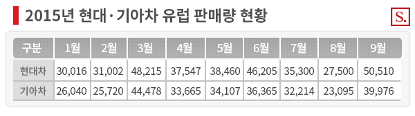 9월 실적 발표 전까지 현대차 유럽 판매량은 줄곧 내리막을 걸어왔다. 지난 6월 판매량 4만6205대에서 7월(3만5300대)과 8월(2만7500대) 연달아 판매량이 줄었다. 특히 지난 8월 처음으로 판매 3만대 선이 무너지며 우려를 낳았다.