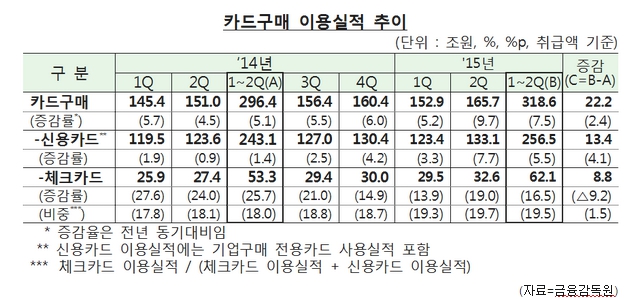 15일 금융감독원(원장 진웅섭)에 따르면 올 상반기 신용·체크카드를 이용한 구매실적은 318조6000억원이다. 카드 구매실적은 지난해 같은 기간에 비해 22조2000억원(7.5%) 증가했다.