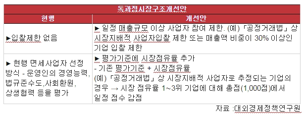 면세점의 독과점 구조를 개선하기 위해 입찰 시 매출 규모와 시장점유율에 따라 입찰을 제한하자는 주장이 나왔다. 개선안대로라면 롯데와 신라는 앞으로 만료되는 면세점 특허권의 신규 재입찰에 참여할 수 없게 된다. 특허수수료는 10% 인상을 전제로 최고가 경쟁 입찰 방식 등이 제시됐다.