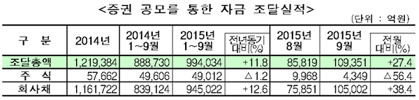 21일 금융감독원(원장 진웅섭)이 발표한 9월중 기업 직접금융 조달실적에 따르면 기업 직접금융 조달실적은 총 10조9351억원이다. 전월에 비해 2조3532억원(27.4%) 증가했다.