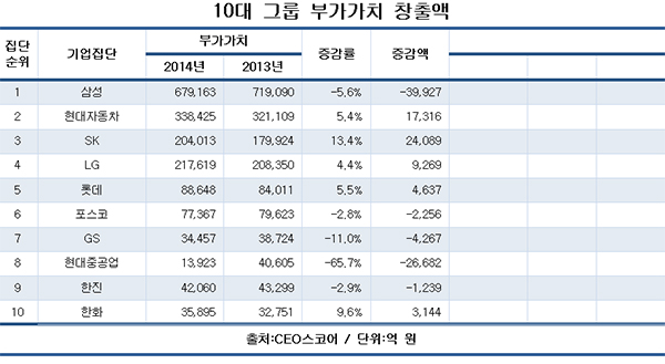 부가가치액이 늘어난 기업도 있다. 10대 그룹 중 SK(2조4089억원)를 비롯해 현대자동차 (1조7316억원), LG(9269억원), 롯데(4637억원), 한화(3144억원) 등이다. 대우건설(1조651억 원), 금호아시아나(5408억 원), 미래에셋(4612억 원), CJ(4536억 원) 등도 부가가치액이 증가했다.