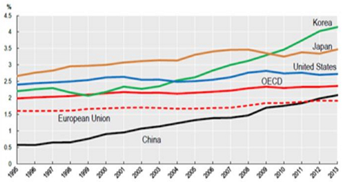 발표에 따르면 한국은 국내총생산(GDP) 대비 연구개발(R&D) 투자 비중이 OECD 국가들 중 최상위권을 기록했다. 한국 R&D 투자 비중은 1995년 2.2%에서 2013년 4.15%로 2배 가까이 증가해 OECD 평균인 2.4%를 뛰어넘었다. 2013년 민간을 포함한 한국의 총 연구개발비는 59조 3009억 원으로 GDP 대비 4.15%를 기록해 이스라엘(4.21%)에 이어 2위를 차지했다.