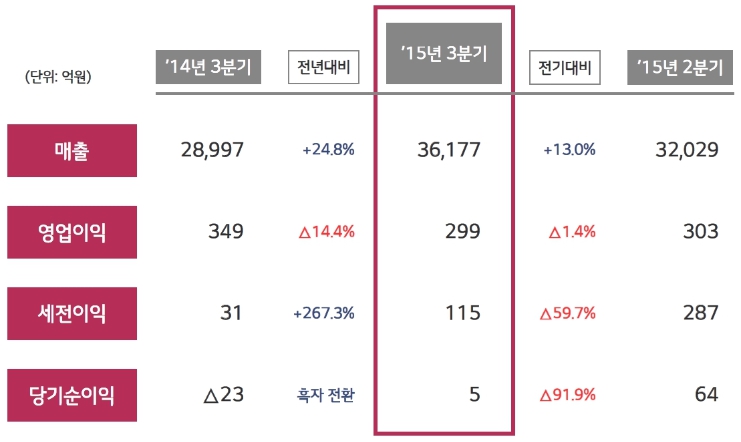 LG상사 관계자는 "비철 시황 부진과 유가 하락이 지속된 탓에 영업이익이 소폭 줄어든 반면, 정보기술(IT), 전자부품 같은 산업재 거래 물량이 늘고 범한판토스의 실적이 반영되면서 매출이 늘었다"고 말했다.