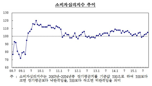 한국은행이 27일 발표한 ‘2015년 10월 소비자동향조사 결과’에 따르면 이달 소비자심리지수(CCSI)는 105로 전달보다 2포인트 상승했다.
