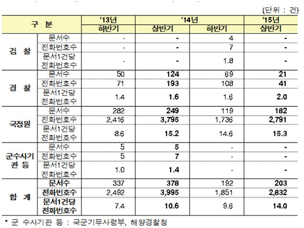 감청 건수는 문서 수 기준 203건, 전화번호 수 기준 2832건으로 집계됐다. 이는 지난해 같은 기간에 비해 각각 175건, 1163건이 감소한 수치다. 문서 1건당 전화번호 수는 평균 14개로 나타났다.