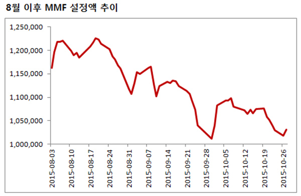 MMF는 수시입출금이 가능해 자금 수요가 몰리는 월말에는 자금유출이 많았다. 지난 8월에도 월말인 31일에는 111조7486억원으로 설정액이 월중 최저치를 기록했고 9월 30일에도 101조2373억원을 기록하며 100조원을 겨우 넘겼다.