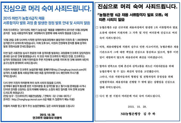 농협은행 관계자는 “합격자 발표 약 20분 후 실수를 발견해 사이트를 폐쇄했고 28일 오후 8시에 정확한 합격자를 발표했다”고 설명했다. 이 관계자는 “책임을 통감하고 이런 일이 재발하지 않도록 채용관리에 최선을 다하겠다”고 말했다.