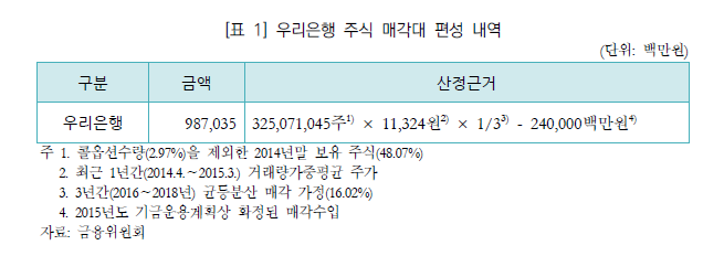 이는 2014년말 보유하고 있는 우리은행 주식 3억2507만1045주, 주당 가격 1만1324원을 기준으로 한 결과다. 우리은행 주가는 최근 1년 (2014년4월∼2015년3월) 거래량 가중평균 주가를 기준으로 정했다.