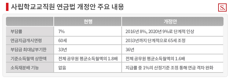 국회 교육문화체육관광위원회 여당 간사인 신성범 새누리당 의원이 발의한 사학연금법 개정안은 현행 7%인 사학연금 부담률을 2016년 8%로 인상한 후 2020년까지 9%로 올리는 내용을 담고 있다. 또 연금지급률 중 1%에 해당하는 부분에 대해 소득재분배 제도를 도입하고, 부담금 최대 납부기한을 현행 33년에서 36년으로 단계적으로 연장하는 내용도 포함됐다. 당초 새누리당은 여야 합의로 공무원연금법을 처리한 만큼 사학연금법 개정도 여야 공동발의를 추진했다.
