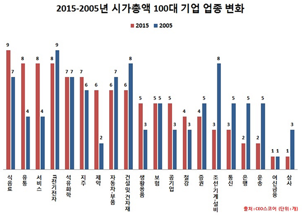4일 기업 경영평과 평가사이트 CEO스코어는 시가 총액(10월30일 종가 기준) 상위 100대 기업을 2005년 말과 비교한 결과 이 같은 결과를 얻었다고 밝혔다.
