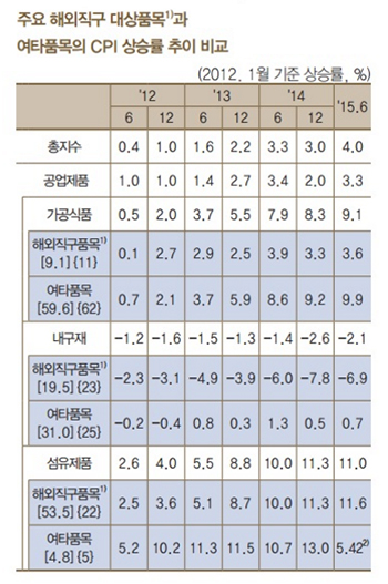 보고서에 따르면 2012년 1월 이후 국내 소비자물가지수(CPI)에 포함된 해외직구 대상품목의 물가상승률은 다른 대상품목의 물가상승률보다 상당히 낮은 추세를 보였다.