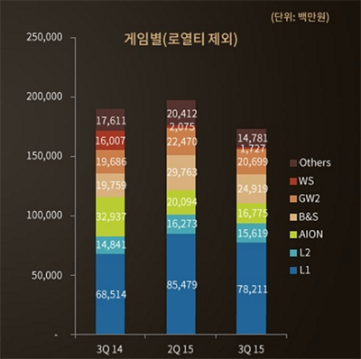 특히 엔씨소프트 게임 매출 절반가량을 차지하는 리니지 매출 하락이 큰 영향을 끼쳤다. 2015년 2분기 리니지 1 매출은 855억원이었지만 3분기엔 782억원으로 감소했다. 기대했던 모바일 게임사업의 부진도 큰 영향을 미쳤다는 분석이다.