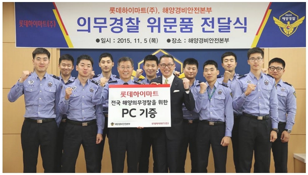 롯데하이마트는 5일 오전 인천 연수구에 위치한 해양경비안전본부에서 해양의무경찰을 위한 PC 전달식을 가졌다. 이 날 전달된 PC는 79대로 4000만원 상당이다.