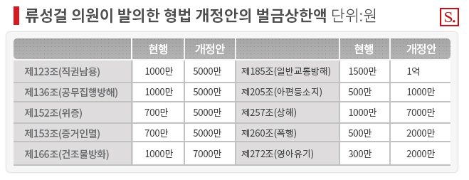 류 의원은 “벌금액을 국민권익위원회의 권고안 및 국회사무처 법제 예규의 기준인 징역이나 금고 1년당 1000만원의 비율로 개정함으로써 벌금형을 현실화할 필요가 있다”며 “벌금의 형벌 기능을 회복시켜 일반인에 대한 범죄 억지력을 확보하려는 것”이라고 강조했다.