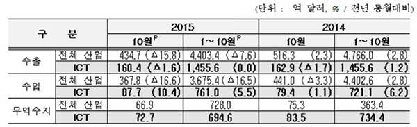 12일 산업통상자원부는 10월 ICT 수출이 지난해 같은 기간보다 1.6% 줄어든 160억4000만달러를 기록했다고 밝혔다. 이는 올들어 최대이며 2013년 10월(166억 달러)이나 지난해 10월(163억 달러)에 이어 역대 3번째로 높은 실적이다. 무역수지는 72억7000만달러 흑자를 보였다.