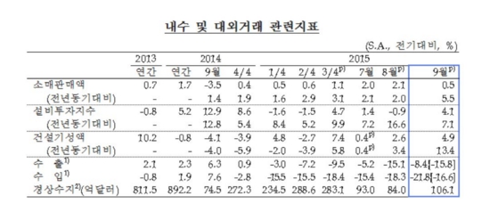 9월중 소매판매는 2.3%로 전월 대비 0.5% 증가했다. 설비투자 및 건설투자도 전달보다 각각 4.1%, 4.9% 늘었다. 반면 수출은 세계교역신장률 저하, 중국 등 신흥국 성장세 둔화 등으로 감소폭이 커진 상태다. 10월중 수출은 지난해 같은 기간에 비해 15.8% 줄었다.