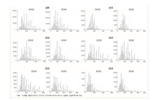 보고서는 30대와 40대에서 임금 분포 양극화 가능성이 큰 것으로 추정했다. 30대는 200만원과 300만원 근방에, 40대는 180만원과 320만원 근방에 임금 분포가 집중됐다.