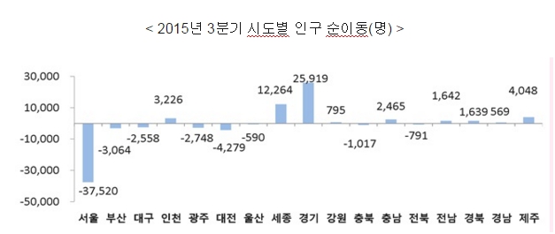 반면 경기(2만5919명), 세종(1만2264명), 제주(4048명) 등 9개 지역은 인구가 늘었다. 일각에서는 서울의 비싼 전셋값으로 주변 위성도시로 인구가 이동한 것으로 보고 있다.