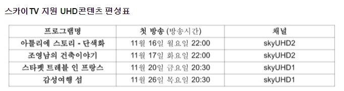 스카이티브이가 중소 제작사를 지원해 만든 초고화질(UHD) 프로그램 4편을 방송한다. 해당 프로그램은 16일부터 skyUHD1채널과 skyUHD2채널에서 나온다. 스카이라이프티브이는 경기콘텐츠진흥원과 공동 추진한 ‘2015년 동방성장 제작지원 사업’으로 만든 콘텐츠를 방영한다고 13일 밝혔다.