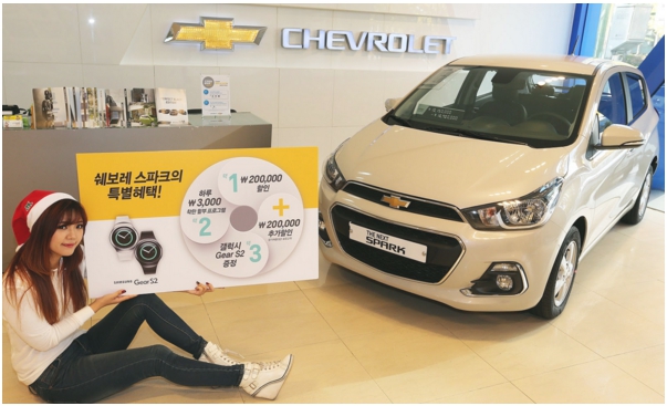 한국GM은 11월 스파크를 구입하는 고객에게 ▲하루 3000원으로 구매 가능한 ‘착한 할부 프로그램’(LS MT 48개월 할부 기준) ▲현금할인 20만원 또는 33만원 상당의 삼성 갤럭시 기어S2 스마트 워치 제공 ▲차량 3년 이상 보유할 시 20만원 추가 할인 혜택을 제공한다.