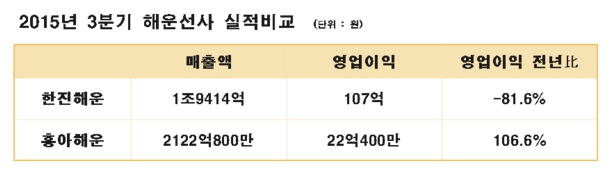 한진해운은 올 3분기 매출 1조9414억원, 영업이익 107억원을 기록했다. 지난해 같은 기간 대비 각각 8.9%, 81.6% 감소했다. 100억 초반의 영업익은 국내 1위 대형 선박 덩치에 걸맞지 않는다는 평가다.
