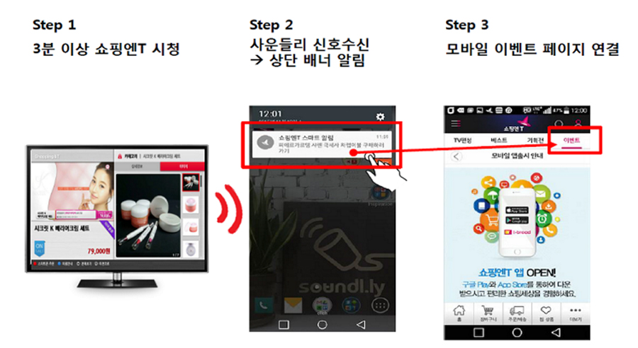 음파가 적용된 영상이 나오면 스마트기기에서 쇼핑엔T에서 제공하는 이벤트 혜택 정보가 뜨게 된다.