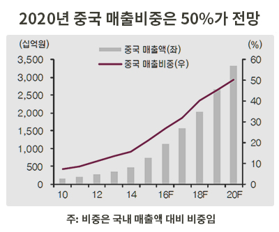 아모레퍼시픽의 중국매출이 2020년까지 3조원 이상으로 확대될 것이라는 전망이 나왔다. 지난해 신축한 상해공장의 생산 능력 확대에 대한 기대가 반영된 것으로 보인다.