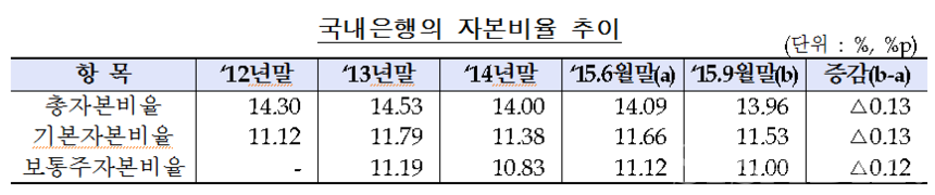 금감원은 3분기중 국내은행의 총자본비율이 하락한 것은 위험가중자산 증가율(3.7%↑)이 총자본 증가율(2.7%↑)을 웃돌았기 때문이라고 분석했다.