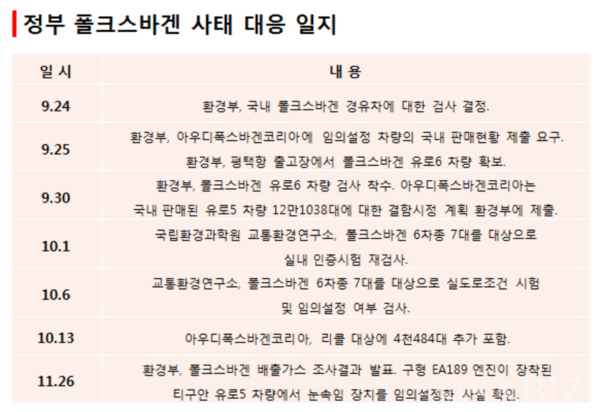 환경부는 26일 정부세종청사에서 브리핑을 열고 "국내에 판매된 폴크스바겐 경유차 6개 차종 7대를 검사한 결과 문제의 'EA189' 엔진이 장착된 티구안 유로5 차량에서 도로주행 중 배출가스 재순환장치를 고의로 작동 중단시키는 임의설정을 확인했다"고 발표했다.