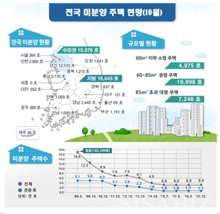 국토교통부는 올해 10월 말 기준으로 전국 미분양 주택이 3만 2221가구로 전달(3만 2524가구) 대비 0.9%(303가구) 줄었다고 26일 밝혔다.