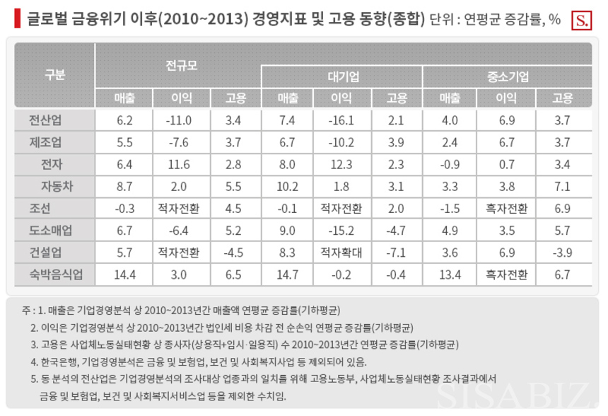 한국경영자총협회가 2일 발표한 '글로벌 금융위기 이후 대·중소기업 경영지표와 고용동향 분석' 보고서에 따르면, 국내 기업들은 글로벌 금융위기 이후인 2010~2013년 사이 순이익이 연평균 11.0% 감소하는 동안 고용은 연평균 3.4% 늘어났다. 같은 기간 매출은 6.2% 증가했다.