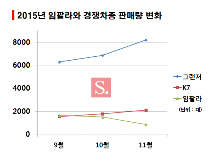 출시 후 세달 가량이 지난 12월, 호샤 사장의 선언은 공수표가 될 가능성이 커졌다. 임팔라 판매량이 줄어드는 동안 그랜저 판매량은 뛰었다.