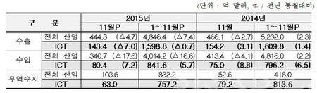산업통상자원부가 10일 발표한 ‘11월 ICT수출입 동향’에 따르면, 수출은 지난해 같은달에 비해 7.0% 감소한 143억4000만 달러, 수입은 7.2% 증가한 80억 4000만 달러를 기록했다. 무역수지는 63억 달러 흑자를 나타냈다.