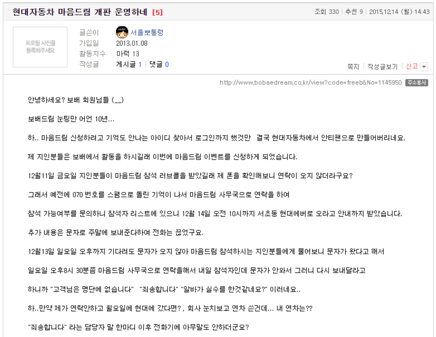 당일 날 행사참석 불가를 통보받은 A씨는 보배드림 게시판에 글을 올려 “11일 참석을 통보받았는데 13일까지 행사 문자가 오지 않아, 현대차에 전화했더니 참석자 명단에 없다더라”며 “알바가 실수를 해서 어쩔 수 없다는 대답을 들었다. 마음드림으로 오히려 현대자동차의 안티팬이 됐다”고 토로했다.