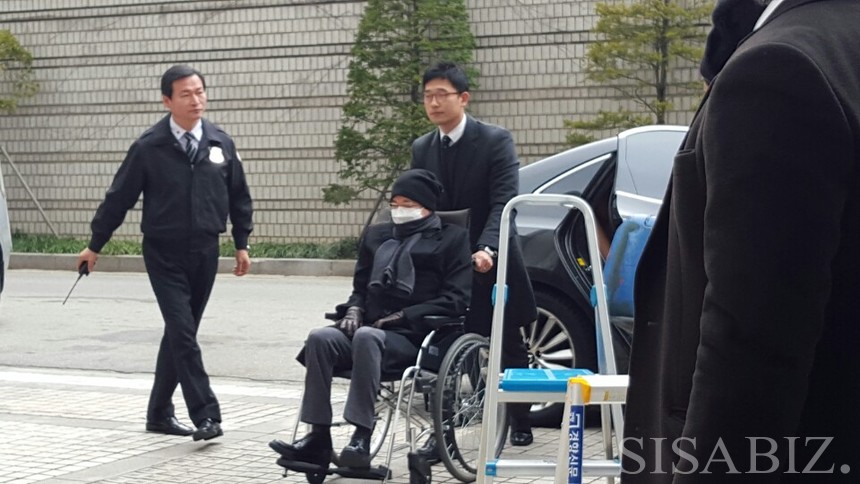 이 회장은 재판 시작 15분 전인 오후 12시 45분경 법원에 도착했다. 검은색 에쿠스 차량을 타고 도착했다. 그는 무채색 계열에 옷을 입고 검은 모자와 마스크를 한 채 차에서 내렸다. 주변의 부축을 받으며 휠체어에 올라 법정으로 향했다.