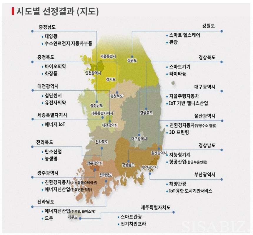 정부는 각 지방자치단체 신청을 받아 지난 14일 지역발전위원회 의결을 거쳐 지역별로 사물인터넷(IoT), 드론(무인기), 바이오헬스, 미래자동차, 스마트기기, 농생명 등 전략산업을 2개씩 선정했다. 서울과 경기, 인천 등 수도권은 선정에서 제외됐고 규모가 작은 특별자치지역인 세종시에선 1개만 선정했다.
