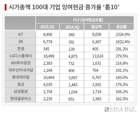 KT가 시가총액 100대 기업 중 최근 1년간 잉여현금 증가율이 가장 높은 것으로 조사됐다. 업종별로는 통신이 증가율이 가장 높았다. 그러나 100대 기업 전체로는 투자 등 자본지출 증가로 잉여현금이 감소했다.
