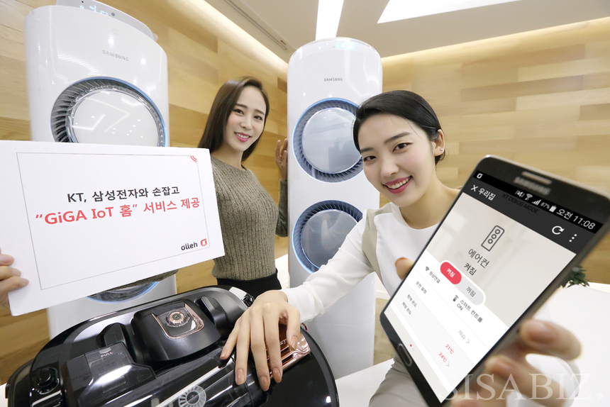 KT는 삼성전자 가전제품 6종을 자사 사물인터넷(IoT) 서비스와 연동한다는 사업 협력 내용을 17일 발표했다. SK텔레콤은 KT보다 이틀 먼저 동부대우전자 제품을 사물인터넷 플랫폼에 연동한다고 밝혔다.