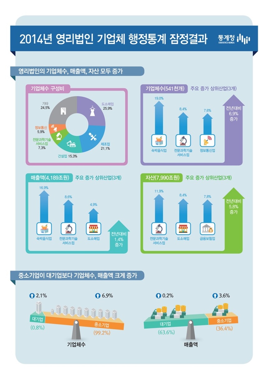 통계청이 18일 발표한 ‘2014년 영리법인 기업체 행정통계 잠정결과’에 따르면 지난해 영리법인 전체 기업체 수는 54만1000개로 1년 전보다 6.9% 늘었다.