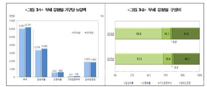 통계청과 한국은행, 금융감독원이 21일 발표한 ‘2015 가계금융·복지조사 결과’에 따르면 올 3월말 가구당 부채는 평균 6181만원으로 전년 대비 2.2% 증가했다. 이 중 금융부채가 4321만원으로 전체의 69.9%를 차지했다. 나머지 30.1%는 임대보증금으로 나타났다.