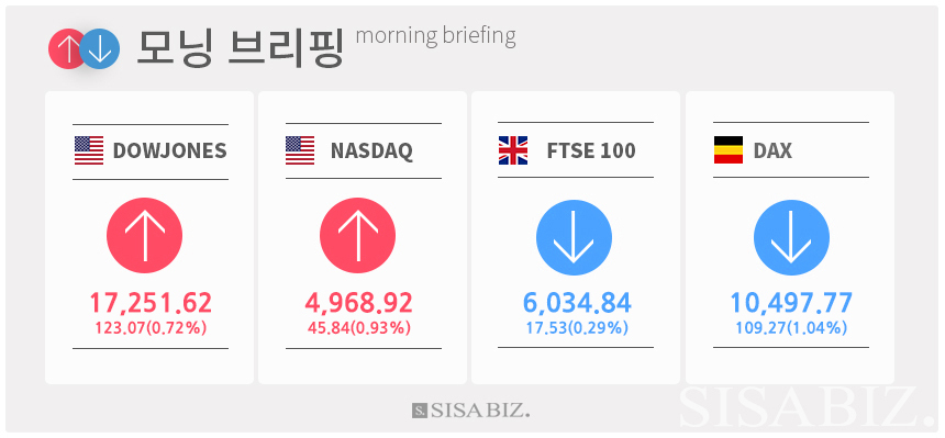 우량주 중심 다우존스 산업평균지수는 전 거래일 대비 0.72%(123.07포인트) 오른 17251.62에 장을 마쳤다. 대형주 중심의 스탠더드앤푸어스(S&P) 500지수는 전 거래일과 비교해 0.78%(15.60포인트) 상승한 2021.15, 기술주 중심의 나스닥지수는 0.93%(45.84포인트) 오른 4968.92를 기록했다.