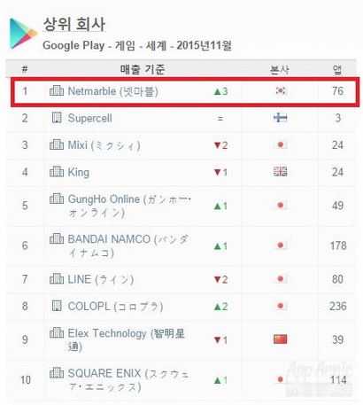 넷마블게임즈가 글로벌 모바일 앱 통계 분석 사이트 '앱애니(App Annie)'가 발표한 전세계 모바일 게임 구글플레이 11월 매출 순위에서 1위를 기록했다.