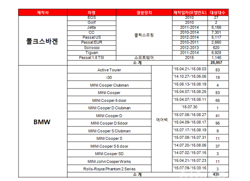 폴크스바겐과 BMW 23개 차종 약 2만9000대가 제작결함으로 리콜된다.