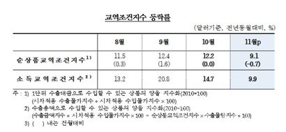 순상품교역조건지수는 상품 1단위를 수출한 대금(달러 기준)으로 수입할 수 있는 상품의 양을 지수(2010년 100 기준)로 나타낸 것이다. 수출총액으로 수입할 수 있는 상품의 양을 지수화했한 소득교역조건지수는 135.89로 지난해 같은 달보다 9.9% 올랐다. 사상최고치였던 10월(146.22)보다는 7%가량 하락했다.